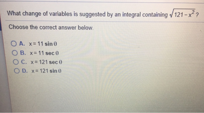 So before we move into changing variables with multiple integrals we first need to see how the region may change with a change of variables. 157 Change of Variables. When using trigonometric substitution to solve an integral containing V9 x² which of the following change of variables is suggested.